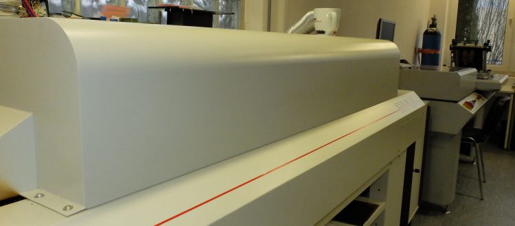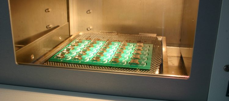 Bei uns gefertigte Baugruppen werden in einem Vollkonvektionsofen gelötet. Maximale Platinenbreite liegt bei ca. 300mm. Anspruchsvolle Platinen löten wir in einer Dampfphasenlötanlage. Dies ist insbesondere bei Platinen mit hoher Wärmeaufnahme, wie z.B. bei Pin in Paste, oder bei einem geforderten sauerstofffreien Prozess empfehlenswert.